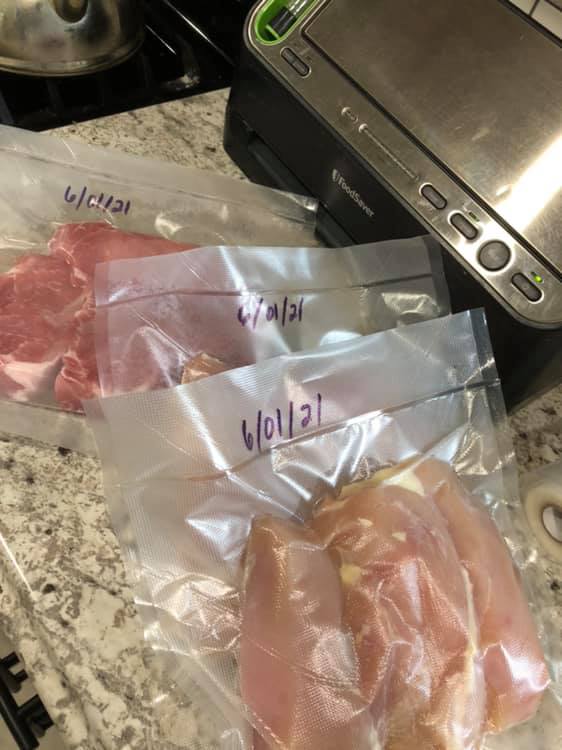 If you can afford it, I *highly* recommend purchasing a vacuum sealer. It will be worth the money you spend on it–I promise! Vacuum sealing helps protect your meats and produce from freezer burning and it will extend the life of your perishable items in the freezer. If you are going to buy meat to store in your freezer like I do, a vacuum sealer is a must. I use it for everything from chicken breasts and pork chops to roasts. I will take the meat out of the store packaging and repackage and label it to go in my freezer. This the Foodsaver Vacuum Sealer that I’ve had for years and use a couple times a week.