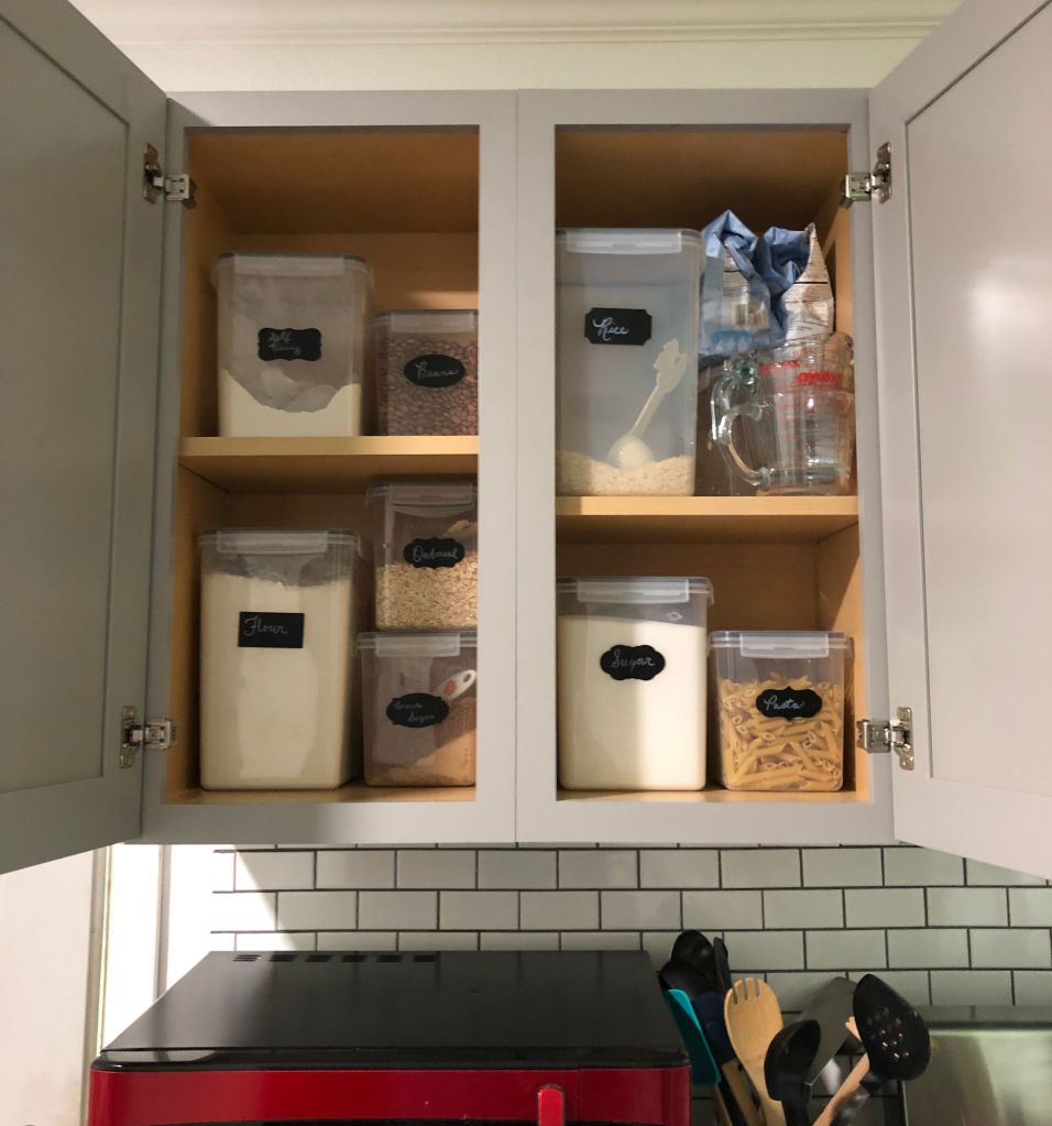 Things like flour, sugar, rice, dried beans, oatmeal, cornmeal, etc., will keep for a long time in airtight containers. You can buy 10 & 20 lb bags of these items and be set up for a while. I recently bought these canisters and LOVE them. I can see what and how much I have, and they stack neatly and fit in my cabinets. They even came with the cute labels and a chalk marker.