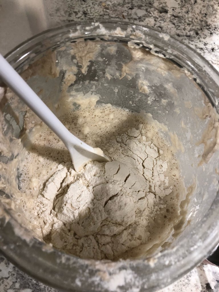 Add your salt, and continue adding and mixing remaining flour until you have a sticky, somewhat stiff dough with as few dry spots as possible.