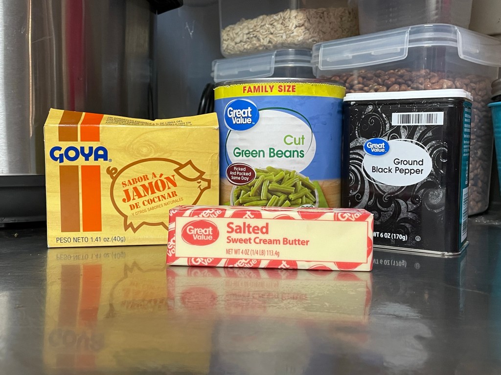 All you need is two regular cans of green beans or one family sized can of green beans, space two packages of Goya ham flavoring black pepper and some butter .